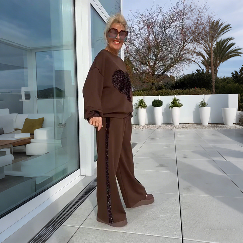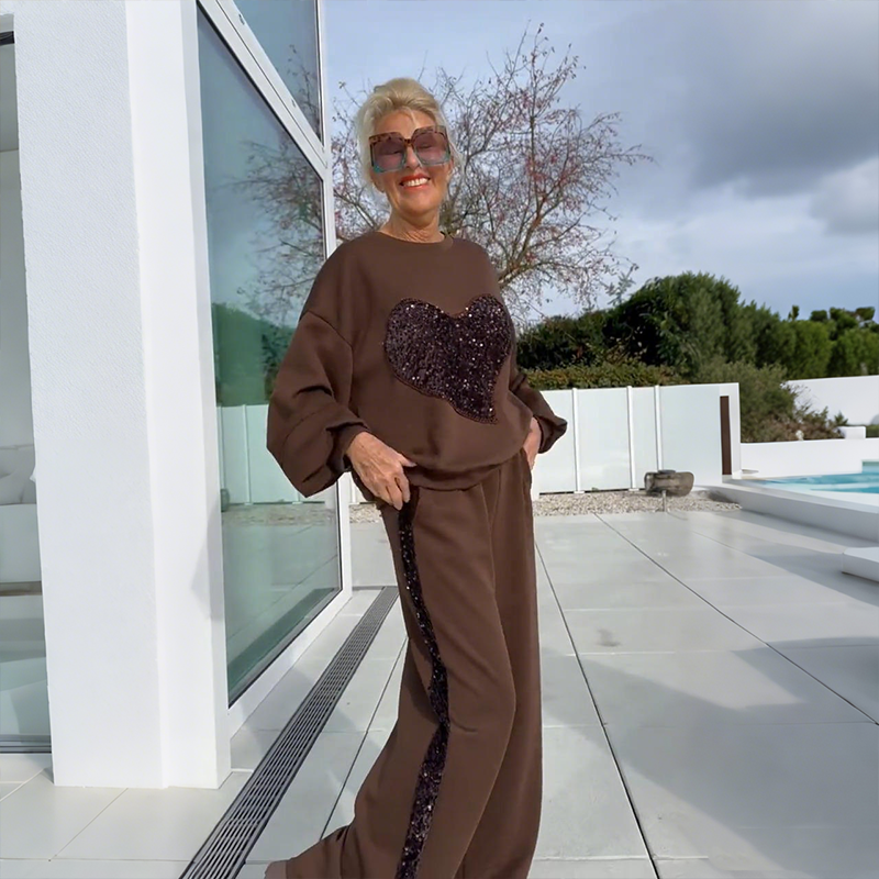 A cosy and stylish two-piece set featuring a sparkling sequin heart top and relaxed-fit trousers. Made from soft, breathable premium fabric, it offers comfort, versatility, and everyday elegance for lounging or casual outings.