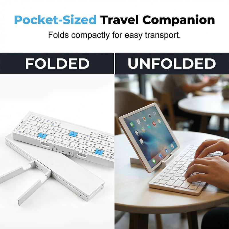 ULTRA-SLIM FOLDING BLUETOOTH KEYBOARD - Experience ultimate portability with our ultra-slim folding Bluetooth keyboard. Designed for seamless typing on smartphones and tablets, it transforms any space into your personal workstation instantly.