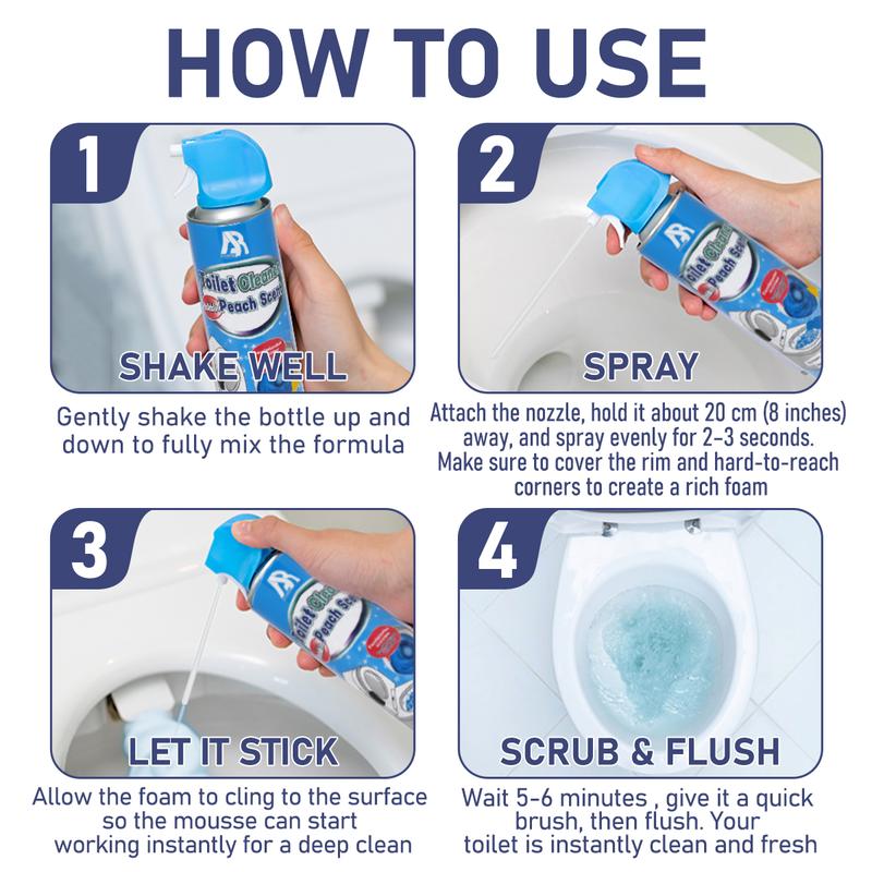 WC-Schaumreiniger – Dehnt sich aus, um schwer zugängliche Ecken zu reinigen, entfernt Flecken und Gerüche und hinterlässt einen leichten Pfirsichduft.