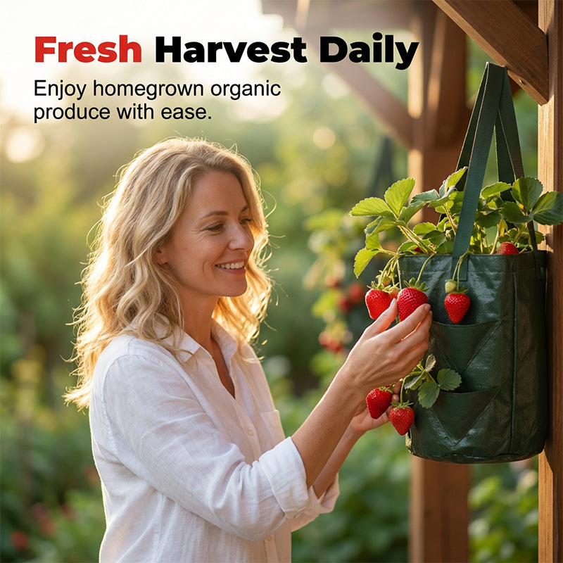 HIGH-YIELD HANGING STRAWBERRY PLANTER - Transform any sunny wall or fence into a lush, productive garden. This premium hanging planter features multiple side pockets, perfect for strawberries, herbs, and vibrant flowers.