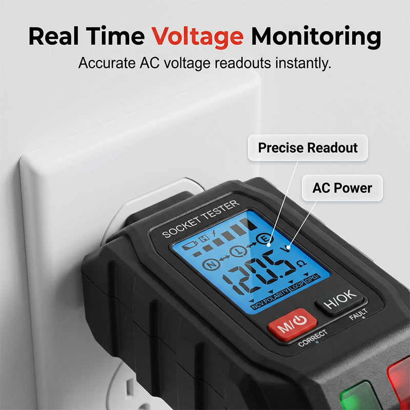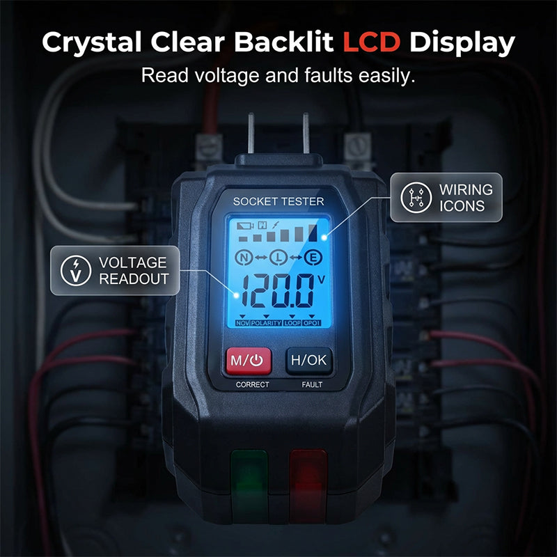 CRYSTAL CLEAR BACKLIT LCD DISPLAY - The bright, backlit LCD screen provides real-time voltage readouts and clear wiring status indicators, making it easy to read even in dark environments.