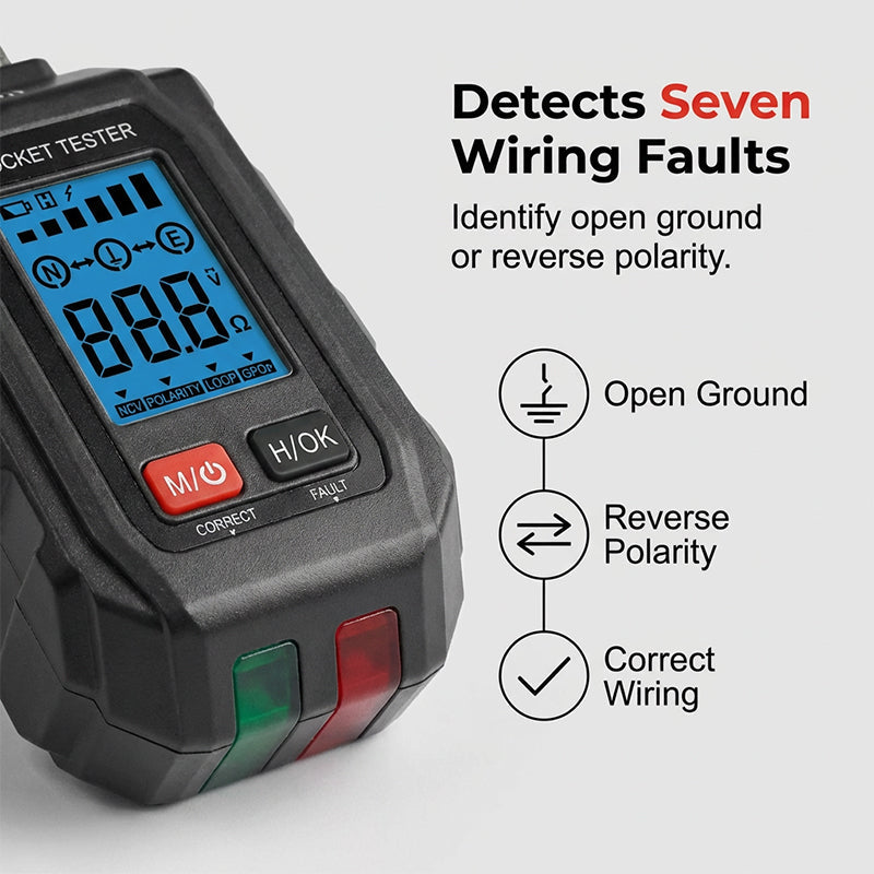 DETECTS SEVEN WIRING FAULTS - Comprehensive diagnostics at your fingertips. Instantly identify common wiring issues including open ground, open neutral, and reverse polarity to ensure proper installation.