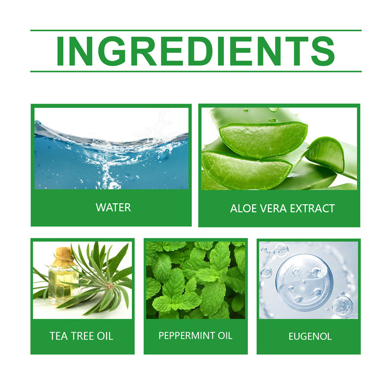 Material: Water, Aloe Vera Extract, Tea Tree Oil, Peppermint Oil, Eugenol
