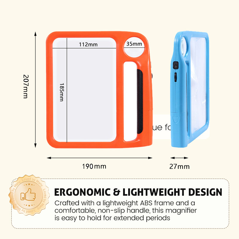 ERGONOMIC & LIGHTWEIGHT DESIGN - Crafted with a lightweight ABS frame and a comfortable, non-slip handle, this magnifier is easy to hold for extended periods. Its balanced design minimizes hand fatigue during long reading or hobby sessions.