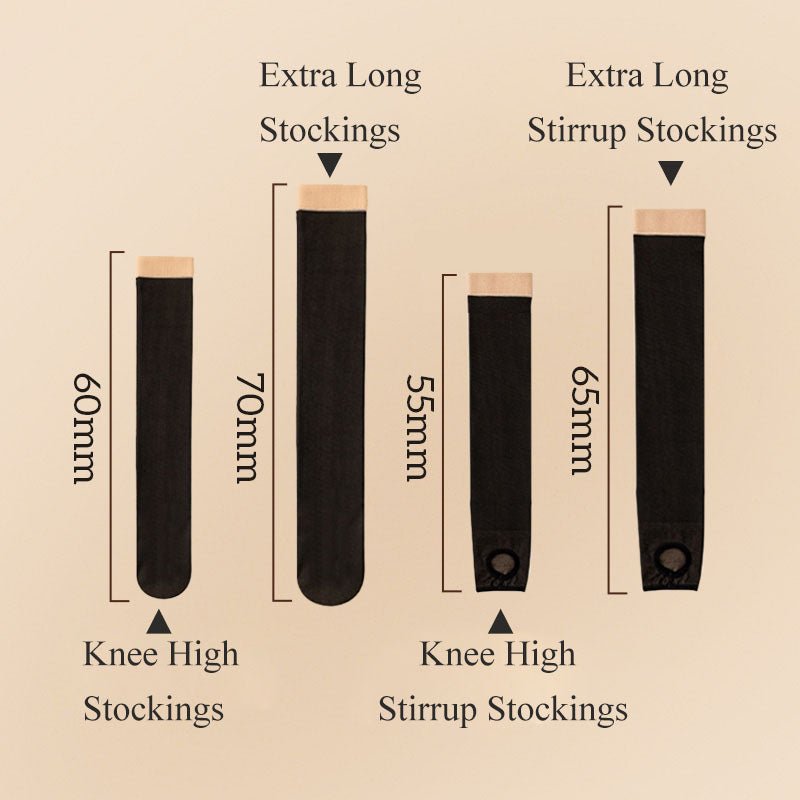 Total Length: Extra Long Stockings 70cm, Extra Long Stirrup Stockings 65cm, Knee High Stockings 60cm, Knee High Stirrup Stockings 55cm