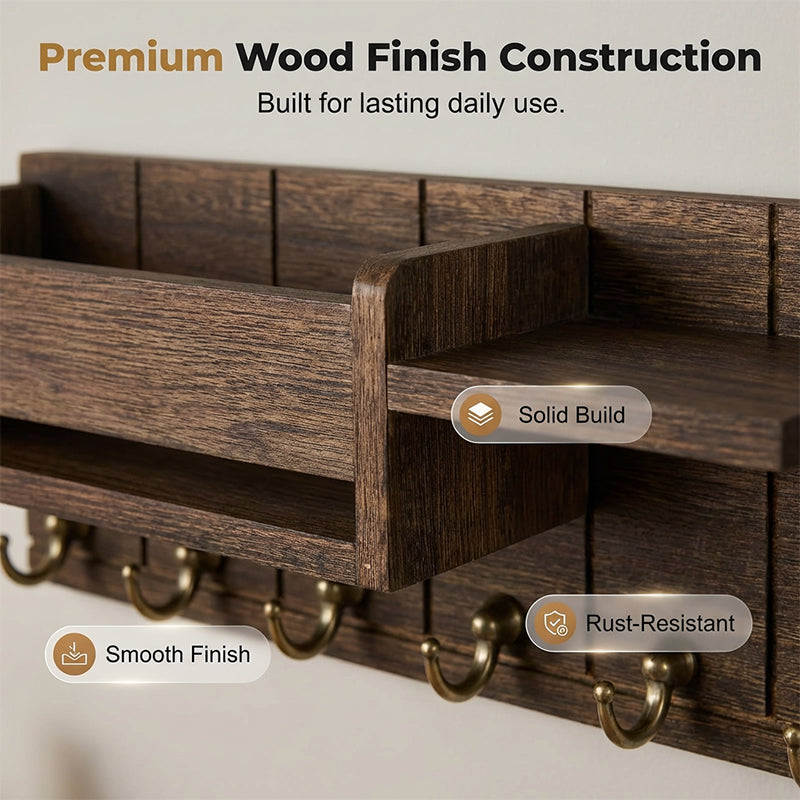 ULTIMATE ENTRYWAY MAIL AND KEY HOLDER - Transform your entryway with this premium wall-mounted mail and key holder. Featuring a spacious basket, display shelf, and sturdy hooks for ultimate organization.
