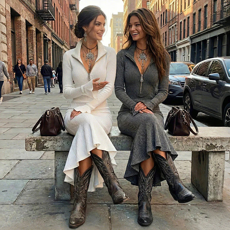 Women's Zipper Lapel Flare Sleeve Knit Fishtail Dress
